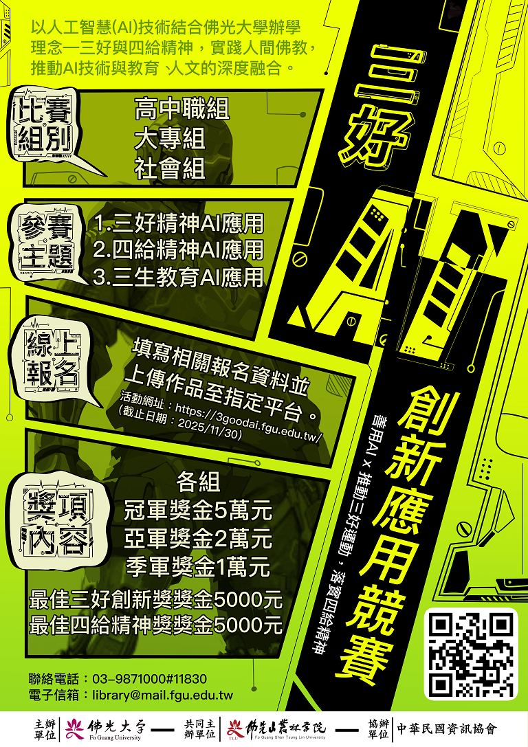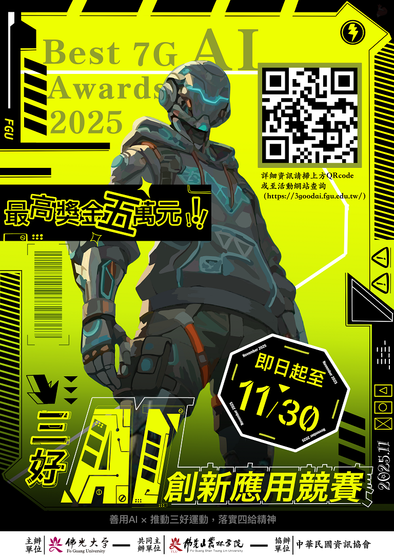 活動詳情與報名方式請至「三好AI創新應用競賽」https://3goodai.fgu.edu.tw/網頁查詢。
