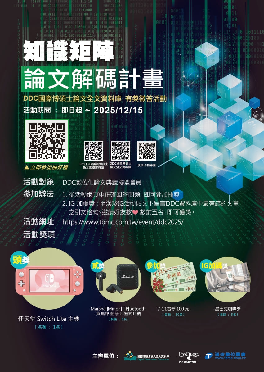 厂商汉珍数码图书股份有限公司为提升DDC数码化论文典藏联盟共建共享之数据库使用效益,特进行《知识矩阵 论文解码计画》有奖征答活动。只要您透过本活动正确回答问题,即可参加抽奖,有机会抽中Switch Lite 主机、Marshell无线耳机等超值好礼,加码IG人气活动送您喝星巴克,欢迎立即来挑战!